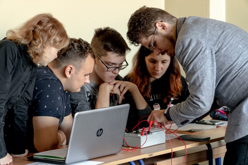 Vchádzame teda do triedy. Lavice sú po obvode miestnosti a uprostred niekto naťahuje zamotané káble a ukladá ich vzorne vedľa seba pri zariadeniach, na ktorých sa študenti učia zapájať elektrické obvody.